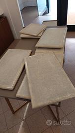 Vendo lastre in marmo beige (tipo Botticino/Perlato) con bordo stondato e piano centrale bocciardato/antiscivolo incorniciato da fascia levigata. Pezzi robusti e decorativi, ideali come davanzali, top per espositori/tavolini, mensole, soglie o rivestimenti.