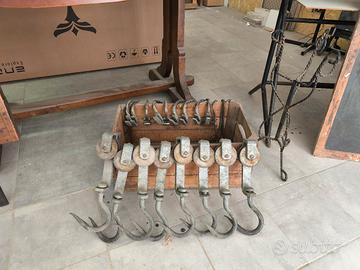 -set di antiche carrucole da macellaio con ganci e cassetta di legno