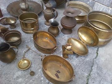 Vendo lotto di oggetti in ottone ed ottonati , ( 25 pezzi in tutto, tra portavasi/cachepot , piatto centrotavola, versatoi, ciotoline, scatola, piattini , portaincenso, oggettini vari, come da FOTOGRAFIA), di produzione nazionale ed etnici.