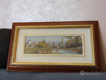 Curandai: Olio su Tela firmato di 36x13 cm (con cornice di 55x32 cm) - Paesaggio fluviale e campestre
