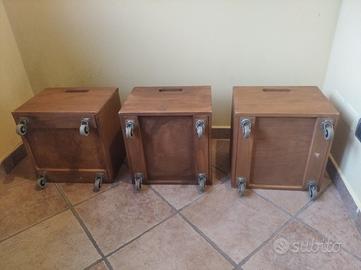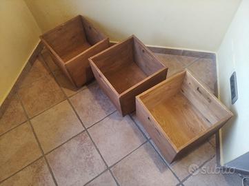 vendesi lotto di 3 scatole contenitori multiuso su ruote, legno di pino, Ikea. Ritiro a Sasso Marconi o trasporto a Bologna da concordare.