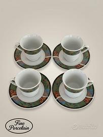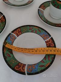 Splendido set di 4 tazzine da caffè con piattini coordinati, risalenti ai primi anni '90. Un vero pezzo di design vintage caratterizzato da una vivace fascia decorativa astratta che richiama i colori del sole e della natura. Dettagli principali: Materiale: Porcellana fine di alta qualità, leggera e resistente. Design: Decoro geometrico/astrale sui toni del verde smeraldo, arancio e blu cobalto, rifinito con bordi neri grafici. Uno stile tipico del periodo, perfetto per dare un tocco di colore alla tavola. Condizioni: Ottime/Eccellenti. Non presentano sbeccature, crepe o segni di usura sul decoro. Sono state conservate con cura. Epoca: Circa 1990. Perché sceglierle: Ideali per chi ama lo stile rétro degli anni '90 o per chi cerca un set unico da aggiungere alla propria collezione di porcellane. Ottima idea regalo per appassionati di oggettistica vintage.
