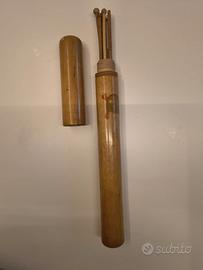 raro portaferri antico in legno tornito con chiusura a vite, decorato con immagine di un gomitolo e completo di ferri da maglia e uncinetti originali d'epoca all'interno.