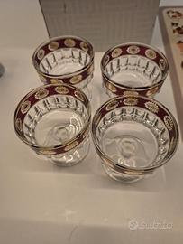 set di 4 coppe/bicchieri da dessert in vetro lavorato con elegante banda bordeaux e decorazioni floreali in oro zecchino, stile anni '60/'70.