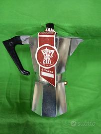 Articolo A: Una Caffettiera in alluminio con manico in melamina e bisplendente della Ital-express per 6 tazze, nuova e funzionante.