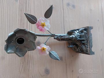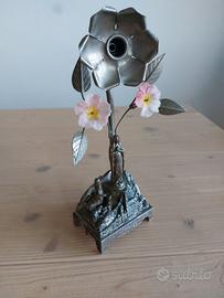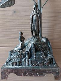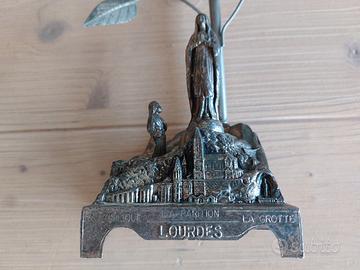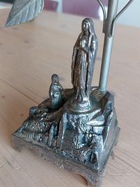 Lourdes, composizione floreale interamente metallica (tranne i 2 fiori) con Madonnina, grotta e basilica. Altezza 25 centimetri, base 9 x 6 centimetri.
