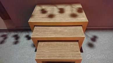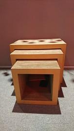 Composizione di tre tavolini modello Low Table, l'architetto Frank Gehry noto per l'utilizzo di materiali non convenzionali è riuscito nel dare nuova dimensione estetica ad un materiale ordinario come il cartone, sebbene il loro aspetto sia sorprendentemente semplice, risultano robusti e stabili. Prezzo del set completo.