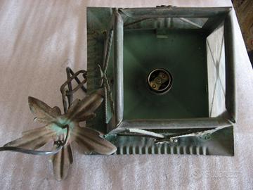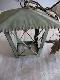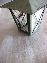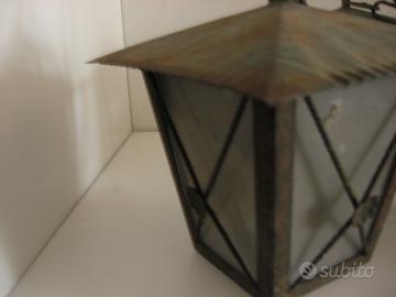 luce da esterno a lanterna anni 70 in ferro/rame (tre vetri mancanti) dimensioni. 20x 15 (altezza) X 6 (base)