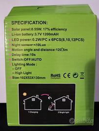 Vendo nuovissima Luce per esterni a batteria solare con sensore di Movimento mai utilizzata misure 102x53x130 mm. Per le specifiche vedasi fotografia