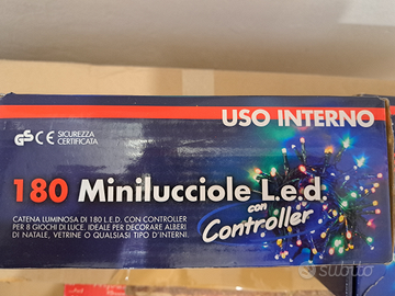 Vendo 2 confezioni di luci decorative da interno. Ciascuna catena luminosa è da 180 minilucciole LeD, con controller per 8 giochi di luci diversi, lunghezza di 6,5mt. più 1,5mt. di filo.