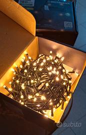 Vendo catena di luci, lunga 7,2 m con 2 metri di cavo di collegamento.Il cavo è verde, le luci sono di color oro, molto particolare e d'effetto,8 giochi di luce, sia per interno che per esterno.