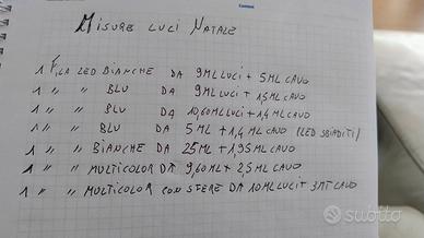 Vendo varie file di luci natalizie,colori vari (blu,verde acqua,bianche,multicolore) 9 euro a fila,tutte funzionanti.Le misure sono presenti in foto,ne ho anche verde acqua e 2 o 3 file vintage a incandescenza lunghezza 5 metri e 2,5 metri.Per info e disponibilità,scrivere pure.Grazie,Ale.