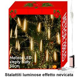 Un Natale senza neve non è davvero Natale e grazie a queste meteore luminose LED è️ è possibile creare un suggestivo effetto nevicata anche quando il clima non lo permette. Il set è composto da 8 tubi luminosi trasparenti, ciascuno con 36 LED, collegati tra loro da cavo trasparente e distanziati di circa 50 cm. L’alimentazione è ad energia elettrica tramite alimentatore 230/7V ed è possibile collegare più set in serie utilizzando un’unica presa.