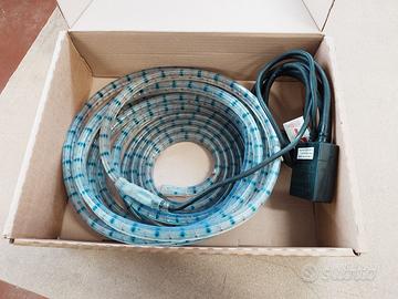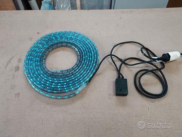 Luci colorate rosse e blu varie combinazioni di colori e intermittenze. Luci rivestite in pvc con sezione 2x1cm. Lunghezza 8 metri più cavo 2,5 metri.
