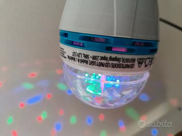 Kit luci per festa discoteca domestica semiprofessionale composto da tre lampade stroboscopiche come segue: 1) faretto LED multicolor da 18W con 6 led colorati in movimento libero o sincronizzato (a tempo di musica). Modalità microfono attivo/auto/DMX/Master-slave. 7 canali, corpo in metallo, colore bianco. 2) faro con luce bianca flash lampeggiante 150W per effetto moviola o psichedelico, velocità lampi regolabile, corpo in metallo, colore nero. 3) lampada LED da 3,2W con attacco E27. cupola prismatica rotante. In omaggio, per chi ritira sul posto (Mestre), due lampade da tavolo ambentali, una rossa e una nera. Usate solo una volta. Le foto non rendono l'effetto visivo perchè cambia troppo rapidamente per essere fotografato.