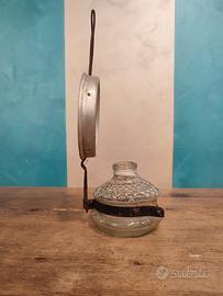 Questo lume, presumibilmente risalente a fine '800/inizio '900, presenta un serbatoio in vetro trasparente lavorato (motivo a rombi/quadretti) ed è montato su una struttura in metallo che regge un riflettore circolare (che funge da specchio) per indirizzare la luce.