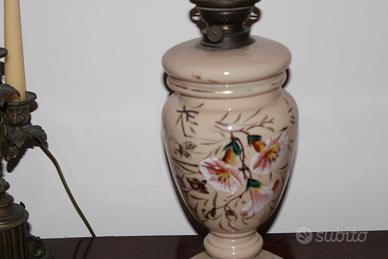 Bel lume a petrolio, ritengo in opalina, mancante purtroppo della boccia a copertura della fiammella. Funzionamnte se si aggiunge lo stoppino ed il petrolio