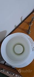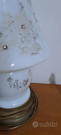 lume in vetro decorato a mano con applicazioni di cristalli, colore bianco e dorato, piccole imperfezioni di colore nella base in metallo
