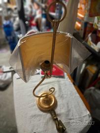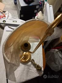 lume da tavolo classico ed elegante in ottone e rifinito foglia oro,con paralume a ventola in pergamena bordo con passamaneria oro,