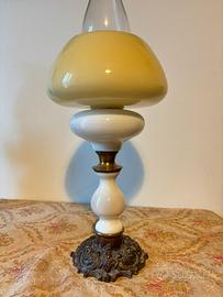 Vendo antico lume a petrolio in bronzo e vetro opalina bianco del XIX secolo, con paralume in vetro giallo.