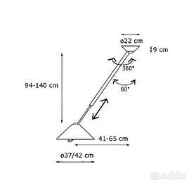 Lampada A SOSPENSIONE, caratterizzata da un giunto a sfera, che le permette di ruotare a 360°, e da un braccio estensibile telescopico che può anche ruotare di 60°. Lampadina alogena max 150W.