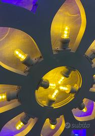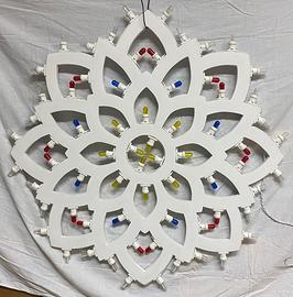 Realizzata in multistrato di pioppo intagliato con tecnica tradizionale (no cnc), verniciata di colore bianco opaco, diametro 100 cm, 68 lampadine led collegate in parallelo. Dotata di ganci di sospensione e alimentatore. Ha funzionato per non più di 10 ore.