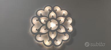 Vendo luminaria salentina a forma di fiore contornato da cuori diametro 60 cm con 21 lampade luce bianca calda a led super luminose come da foto completa di alimentatore 12V. Diffidate dalle imitazioni fatte in serie, questa luminaria è realizzata interamente a mano dal disegno, all'intaglio del legno, alla verniciatura, all'impianto elettrico. Le piccole imperfezioni presenti non sono da considerarsi come difetti ma come dei veri e propri pregi di artigianalità che ne fanno un prodotto unico diverso l'uno dall'altro.
