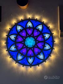 Luminaria salentina artigianale dal diametro di 1 metro; telaio in legno illuminato da luci led a basso consumo (colori personalizzabili). Ideale sia per uso decorativo che espositivo oppure per arredo di interni ed esterni.