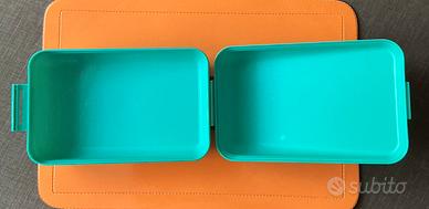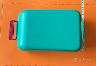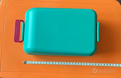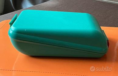 Pratico contenitore Tupperware “Lunch box da asporto” molto capiente. Infrangibile per trasportare un tramezzino, frutta e una bibita. Presenta qualche graffio. Per le misure vedi foto