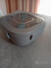 Vendo lunch box, nuovo mai usato, con porta insalata, vaschetta con divisori, piccolo contenitore e posate.