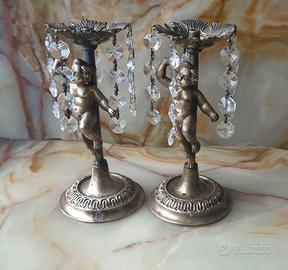 Le graziose figure di cupidi sostengono portacandele o lampade ornate da cascate di pendenti in vetro sfaccettato che riflettono magnificamente la luce. La base in metallo con una patina nobile enfatizza il carattere vintage di questi pezzi.Progettati in stile neoclassico con elementi del neoclassico Luigi XVI (con un accenno al barocco/rococò).Un'atmosfera molto "francese",tipica dell'arredamento da salotto.Periodo:1950-1970– il dopoguerra,un'ondata di decorazioni d'interni per soggiorni e salotti.