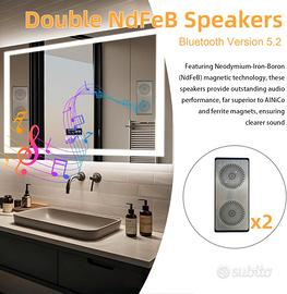Specchio Bagno Led con Bluetooth: Molto adatto per gli amici a cui piace ascoltare la musica in bagno, godersi il tempo trascorso con la musica. Dotato di 2 altoparlanti NdFeB, suono surround a 360°, qualità del suono chiara e completa, la qualità del suono Bluetooth 5.2 è chiara e piena, ha un forte equilibrio generale. La password predefinita è 1618