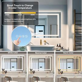 3 Temperature Colore & Dimmerabile: Lo specchio bagno led illuminato da 100x70 cm ha tre temperature di colore: caldo 3000K, neutro 4000K e bianco 6000K. Tieni premuto il pulsante della luce per regolare la luminosità dal 20% al 100%. Perle luminose ad alta densità con 168 luci al metro