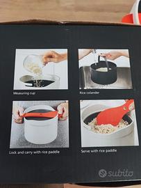 Il set è composto da una pentola da 2 litri, uno scolapasta, un misurino e una paletta per riso multiuso