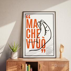 Esplora il linguaggio universale dei gesti napoletani con il nostro poster minimalista 'Ma che vvuò?'. Quest'opera d'arte cattura l'espressività e la passione dei napoletani attraverso la rappresentazione stilizzata di uno dei gesti più iconici. Un semplice ma potente gesto che dice più di mille parole, raccontando storie, esprimendo emozioni e arricchendo ogni conversazione. Un tributo alla ricca tradizione comunicativa di Napoli, questo poster è perfetto per chiunque voglia celebrare l'arte non verbale di questa vibrante cultura. Il poster presenta uno stile minimalista ma altamente espressivo, centrato su un gesto iconico della cultura napoletana: la mano raccolta con le dita unite a forma di “becco” rivolta verso l’alto, universalmente riconosciuto in Italia (e oltre) per esprimere frustrazione, incredulità o domanda intensa. È un gesto spesso accompagnato dalla frase “Ma che vuoi?” — qui rappresentata nella traslitterazione dialettale “Ma che vvuò”. Questo poster è molto più di una grafica elegante: è un omaggio visivo al linguaggio del corpo napoletano, che è ricco di significati e universalmente comprensibile anche da chi non parla italiano.