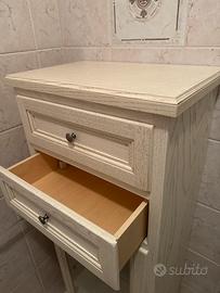 Elegante mobiletto a colonna in legno, finitura bianco avorio decapato, ideale come mobile da bagno o come colonna contenitiva per piccoli spazi.