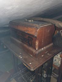 Macchina da cucire vintage a marchio SI GER, di tipo meccanico a pedale, montata su mobile originale in legno massello con struttura in ghisa decorata. Il corpo macchina è in metallo verniciato nero con fregi dorati ornamentali, tipici delle macchine da cucire della prima metà del Novecento.