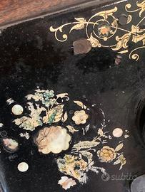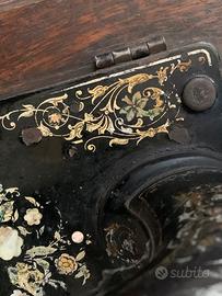 Antica mavchina cucire conservata molto bene, funzionante per chi si volesse cimentare a farlo, dipinta smalti, su base di legno rovere intarsiato.