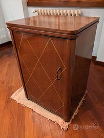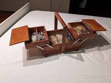 Completa di accessori, mobile contenitore in legno richiudibile e cestino porta cucito a 3 piani a scaletta legno in noce.