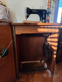 La macchina è il celebre modello Esperia, noto per la sua indistruttibile struttura in ghisa massiccia. È incassata a scomparsa nel suo mobiletto in legno originale, trasformandosi in un elegante tavolino quando non è in uso. Il funzionamento è a pedale, non necessita di corrente elettrica.