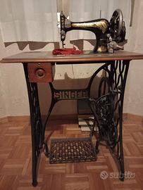 Splendida macchina da cucire Singer antica a pedale, con mobile in legno, prima metà del '900