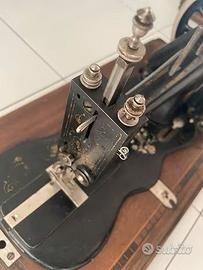 Macchina da cucire antica portatile con custodia in legno con serratura dei primi del ‘900 Seidel & Naumann, funzionante con manovella. Misure H 30 cm x 52 cm x 28 cm.