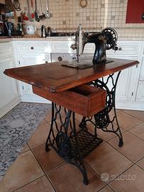 Vendo una macchina da cucire a pedale d'epoca risalente agli anni 40 all'incirca, decorata con dettagli floreali sulla macchina e geometriche sul basamento in legno sotto il quale c'è anche un piccolo cassetto.