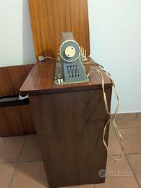 Macchina da cucire meccanica vintage Necchi, costruzione robusta in metallo, pensata per cucito domestico “serio”. È integrata in un mobiletto in legno richiudibile: quando non serve, la macchina rientra nel vano e il piano torna un tavolino; quando si apre, diventa una postazione di lavoro ampia con spazio per riporre accessori e il pedale/reostato.