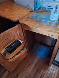 macchina da cucire vintage Necchi BU serie Mira con mobile originale in legno, piano ribaltabile laterale, pedale e vano/cestello porta accessori. Esteticamente è molto bella e completa, con un forte fascino anni ’50