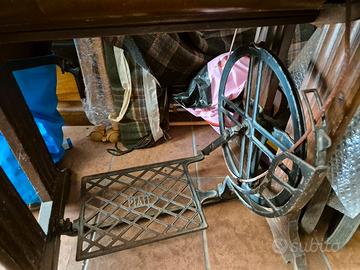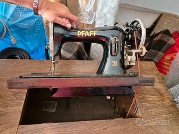 Macchina da cucire PFAFF (anni 50/60) installata su mobile di alloggiamento di supporto e custodia in legno chiaro.