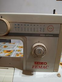 Macchina da cucire Seiko Femac di colore panna funzionante, con pedale. Usata con segni di usura e ben tenuta ha anche la sua sacca da riporre. Ha un 2 graffietti su una manopola laterale , ha anche qualche graffietto sul davanti ma non sono eccessivi.