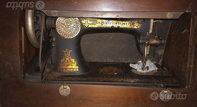 Antica macchina da cucire Singer, completa di tavolino dotato di supporto laterale allungabile all`occorrenza per poter ampliare il piano di lavoro (vedi foto). Il mobile in legno ha uno splendido design: due cassettini laterali sia a destra che a sinistra con tornietti negli angolari, mentre il montante frontale ha un cassettino a scomparsa. L`antica macchina da cucire Singer del 1900/1910 ha uno splendido disegno in oro rappresentante una sfinge. La parte inferiore è in ghisa e ha lo stemma della Singer nel lato sinistro.