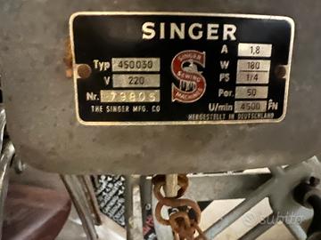macchina da cucire industriale Singer, probabilmente anni ’50–’60, prodotta in Germania (la targhetta indica Hergestellt in Deutschland). Il modello riportato è Type 450030, motore 180W, 4500 giri/min — una macchina da lavoro robusta, da sartoria.