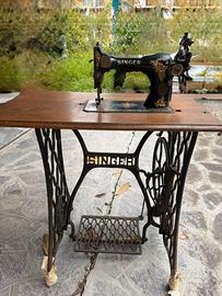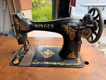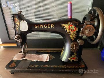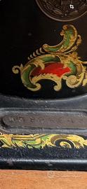 La matricola indica che è stata prodotta nel 1910/1911. Le decalcomanie dorate sono in in ottime condizioni . Nonostante qualche punto di ruggine la macchina è funzionante. Il mobiletto è originale in legno e ghisa . E stata pulita e iliata da in esperto, occorre solo mettere una nuova cinghia L’originale l’abbiamo ma si è rotto nel rimontarla , le cinghie si trovano facilmente Possiamo procurarla noi . Se non soete distanti da Bologna potrei consegnarla a domicilio.